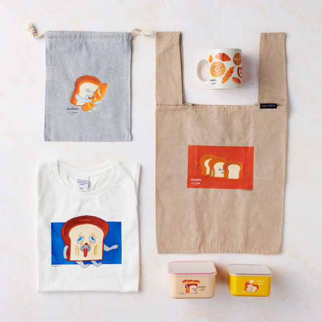 「パンどろぼう」と2作目「パンどろぼうvsにせパンどろぼう」の作中に登場するシーンを切り取り、“日常にひそむ「パンどろぼう」”がテーマのグッズは全6種類。再生コットンを使用し、「hotel koe bakery」の食パンが2斤入る「エコバッグ」や、お弁当箱としても使いやすい「保存容器」、作中に登場する美味しそうなパンのイラストが散りばめられた「マグカップ」など、ここでしか手に入らない「パンどろぼう」のグッズの数々をぜひお楽しみください。