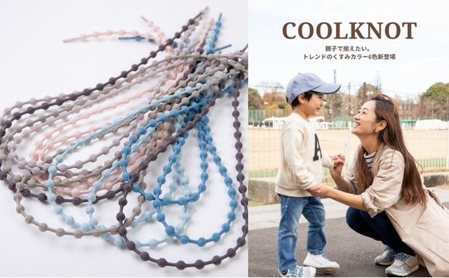 「結ばなくてもいい靴ひも COOLKNOT」に、日常のファッションアイテムとして活用しやすい、カップルやファミリーのさりげないお揃いコーディネートにおすすめのくすみカラー「サックスブルー」「ペールブルー」「パーブリッシュブラウン」「グレージュ」「ペールピンク」「ピンキッシュグレー」の6色が新登場しました。