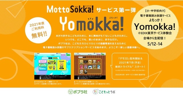 「こどもっとラボ」発の新サービス第1弾として、2021年7月より小・中学校向け電子書籍読み放題サービス「Yomokka!(よもっか!)」の自治体(教育委員会)・学校向けサービス提供を開始します。(小学校:2021年7月~/中学校:2021年秋~対応開始)また、「Yomokka!(よもっか!)」サービス提供開始に先立ち、2021年4月より、導入検討のための「デモID」の発行を開始。EDIX東京ポプラ社ブースでもお申込みを受け付けます。