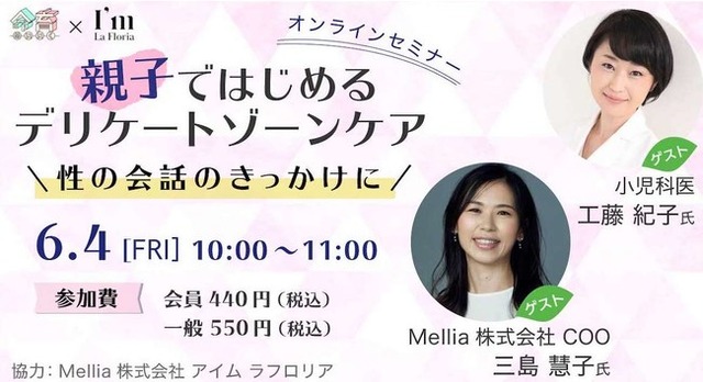 デリケートゾーンケアブランド「I’m La Floria(アイム ラフロリア)」を運営するMellia株式会社は、性教育メディア命育(R)(運営:Siblings合同会社)とコラボレーションし、オンラインセミナーを開催します。親子でできるデリケートゾーンケアの方法や、親子での会話の仕方等を学び、日常生活で実践するきっかけを提供します。
