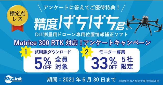ドローンの販売や産業向けソリューションを展開する、SkyLink Japan(株式会社WorldLink & Company 本社:京都市北区、代表取締役社長:須田信也)は、DJI社製RTKドローン専用後処理補正ソフト「精度ばちばち君」(品名:KLAU PPK-J Desktop for DJI RTK)のバージョンアップをリリースし、同時に優待キャンペーンを実施いたします。