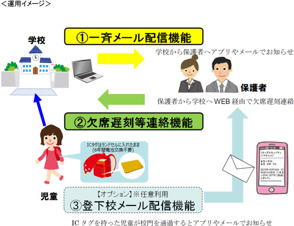 さらに、ご希望の方には登下校メール配信サービス(<運用イメージ>参照)もご利用いただくことができ、川崎市立学校に通う児童・生徒の通学が、より安全・安心なものとなります。