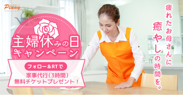 そこでピナイ家政婦サービスでは、5月25日(火)の「主婦休みの日」にあわせて家事代行3時間分の無料チケットが当たるTwitterキャンペーンを実施いたします。