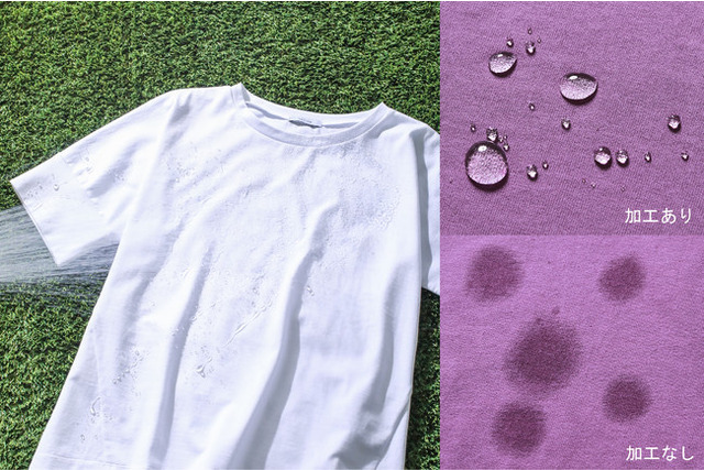 普段使いに便利なコットンのTシャツ。水を吸収してくれるからこそ、ぬれた跡がくっきり目立ってしまいます。手を洗う回数が増えている今、水ハネが気になることもしばしばあるのではないでしょうか。そんな悩みを解消すべく、日常生活での水ハネはもちろん、梅雨や夏場も快適に過ごせる撥水Tシャツシリーズを開発しました。