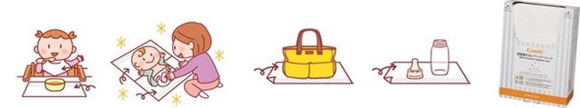 本製品は、水に溶けないラミネートペーパーなので、おむつ替え時はもちろん、哺乳瓶や手荷物の下に敷いたり、フードコートでエプロンやランチョンマットとしても使用でき、お子さまとの外出先での様々なシーンで活躍します。