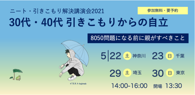 認定NPO法人ニュースタート事務局は、ニート・ひきこもりの親御さんを対象として、解決が難しいとされる高年齢ひきこもりの自立のための具体的な方法をお知らせする無料講演会を開催いたします。