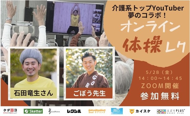 第7回目となる今回は、介護系トップYoutuberである石田竜生さん(チャンネル登録者2万7千人超)とごぼう先生(同2万5千人超)のお二人をお招きして「オンライン体操レク」を開催します。