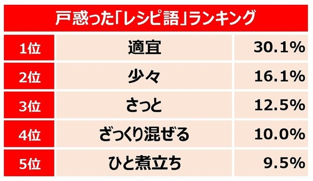 戸惑ったことがある「レシピ語」ランキングでは、1位「適宜」(30.1%)、2位に「少々」(16.1%)、3位は「さっと」(12.5%)という結果になりました[図6]。