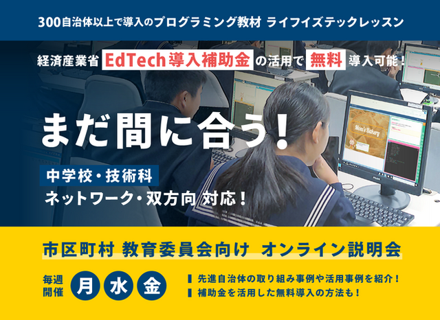 今後、より多くの自治体・学校でライフイズテック レッスンをご利用いただくため、現在新学習指導要領に沿ったプログラミング教材の導入やICT教材を検討されている自治体の皆さま向けに、ライフイズテック レッスンのサービスや、経済産業省の「EdTech導入補助金」を活用したプログラミング教材導入に関するオンラインでの説明会を開催いたします。