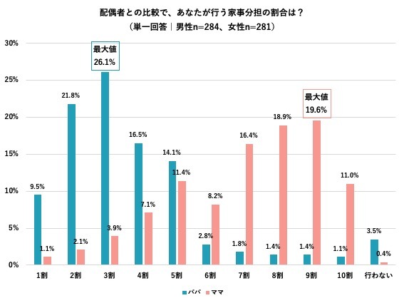 ママ・パパに対し、配偶者と比較してどの程度の割合で家事を分担しているかを質問したところ、ママの回答は「ママが9割の家事を担当している」が最大値(19.6%)となり、パパの回答は「パパが3割の家事を担当している」が最大値(26.1%)となりました。