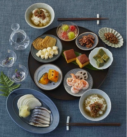 【セット内容】黒酢を使った〆鯖、かぶとしょうがの甘酢漬け、ふっくら厚焼き玉子のみりん漬け、とまとの甘酢ジュレ添え、海老と蓮根の山椒コンフィ、南瓜のバター煮、よもぎ麩の煮物、みりん粕漬けクリームチーズ、いぶりがっこ、胡桃の飴炊き、鴨味噌、茶漬けだし