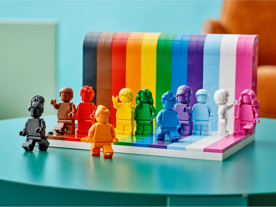 このセットはLGBTQIA+コミュニティで愛と受容の象徴として使われているレインボーフラッグにインスパイアされた組み立て式のディスプレイモデルで、11体の単色のミニフィギュアがそれぞれ個別のヘアスタイルとレインボーカラーで登場します。高さ10.24cm、奥行き12.80cmの346ピースで、棚や窓際に飾りやすいサイズです。