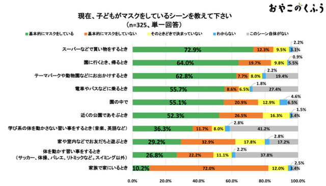 くふうカンパニーグループにおいて、株式会社くらしにくふうが運営する、3歳からの「まなぶ・運動・食べる」をはぐくむメディア『おやこのくふう』(https://oyako-kufu.com/ )は、2021年4月28日~5月5日の期間に、「コロナ禍における子どものマスク事情」に関して、3~6歳の子どもを持つ親325名を対象にアンケート調査を実施しました。初の緊急事態宣言発令から1年以上が経過し、“コロナ禍2年目の夏”を迎えるにあたり、不特定多数の人と接する外出先や通園または園内において、5割以上の親が子どもにマスクを常時着用させる予定であると回答した一方、約9割がマスク着用による子どもの熱中症が気になると回答しました。