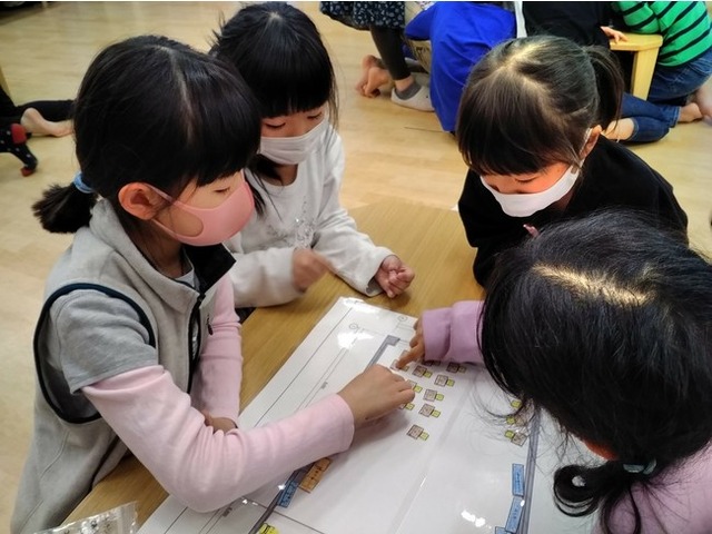 子どもたちがグループごとに議論し合って描いた図面をもとに設計士が作図し、新しい店舗の図面が完成しました。店舗レイアウトが整ったので、各教室の壁紙や床の仕様について、どの色やデザインなら元気に遊べるか、勉強に集中できるかなど、それぞれの場面をイメージしながら子どもたちで話し合いを行いました。そこで決定した仕様をもとに、実際に工事がこれから進んでいきます。