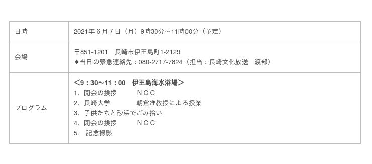 NEXTながさき☆ごみゼロプロジェクト実行委員会は、長崎精道三川台小学校(長崎市)の4年生の児童たちに「海洋ごみ問題」についての学習・ごみ拾いを通して自分たちが住む地域の海の問題やその問題について自分たちにできるものは何か学んでもらう取り組みを開始いたします。この取組は日本財団が推進する海洋ごみ対策プロジェクト「海と日本プロジェクト・CHANGE FOR THE BLUE」の一環で開催するものです。