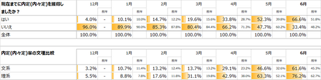 ・内々定率の文理別は、理系が「76.2%」、文系も「61.6%」となった。