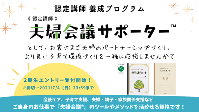 こうした中、子育て夫婦のパートナーシップを育む『夫婦会議』の事業を展開するLogista株式会社(福岡県福岡市、共同代表 長廣百合子(妻)・長廣遥(夫))は、結婚・妊娠・産後・育児期の「夫婦のパートナーシップづくり」「家庭内のより良い子育て環境づくり」に貢献する人財育成に向けて、これまでに磨き上げてきた『夫婦会議』のメソッドやツールをご自身のお仕事で活かして頂ける資格、認定講師「夫婦会議サポーター(TM)」の養成講座をオンラインで開講。2期生のエントリー受付を開始しました。締め切りは2021年7月4日(日)まで。以下で詳細をご紹介致します。