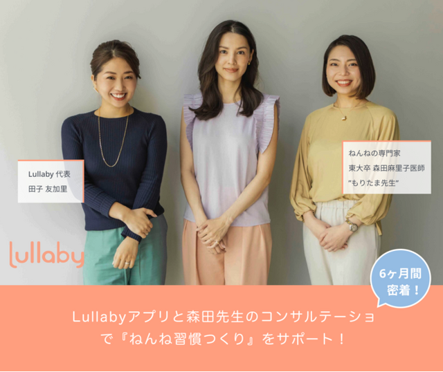Lullabyは乳幼児の夜泣き・寝かしつけに悩むママ・パパを包括的にサポートする3つのサービスが備わったアプリサービスです。開発にあたり、2児の母で東大医学部卒・医師の森田麻里子氏を監修医として迎え、科学的根拠に基づいたデータの使用に拘り、更に日本の住環境・生活に合った情報提供を最重要視することで、忙しいママ・パパでもすぐに活用できるアプリとなっています。