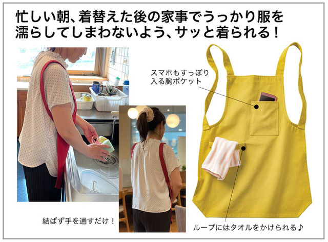 サッと両腕を通すだけ! 締め付けもなくてラクちんなガードエプロン。