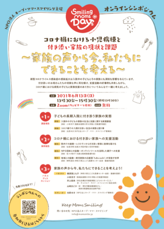 また、この活動に伴い、子どもの入院に付き添うご家族を応援するキャンペーン「Smiling Moms Days~毎日がハハッの日。」(5月9日/母の日~6月20日/父の日)を展開中で、このキャンペーンのイベントとして6月13日(日)に、オンラインシンポジウム「コロナ禍における小児病棟と付き添い家族の現状と課題~家族の声から今、私たちにできることを考える~」を開催いたします。