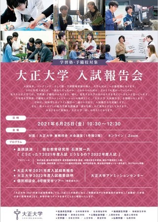 大正大学(学長:高橋秀裕、所在地:東京都豊島区)アドミッションセンターは、受験生を支える塾・予備校の先生方とのコミュニケーションの場所として「大正大学 入試報告会」をハイブリッド開催(対面・オンライン)します。