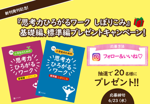 新刊発刊に先立って、『思考力ひろがるワーク 基礎編 しぼりこみ』または『思考力ひろがるワーク 標準編 しぼりこみ』を抽選で20名様にプレゼントするキャンペーンを実施しています。