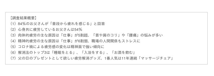 美と健康の総合メーカー、株式会社フジ医療器(本社:大阪府大阪市)は、この度、子どもをもつ20歳以上の男性を対象に「<父の日企画> 第11回 お父さんの疲労事情と解消法調査」を実施いたしましたので、その結果を発表いたします。調査結果からコロナ禍の影響で精神的な疲れが強く出ていることがわかりました。「第11回 お母さんの疲労事情と解消法調査」の結果も交えて詳細をご紹介します。この調査は、2011年より毎年当社が独自に実施しており、今年の調査で11回目を迎えました。