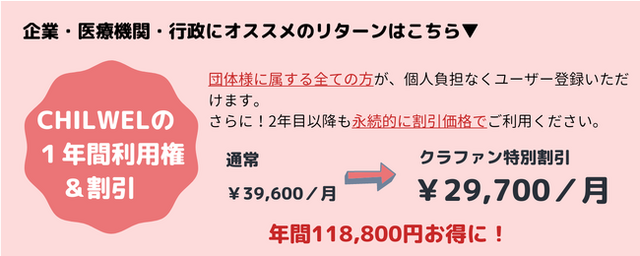 現在、READYFORにてクラウドファンディングを実施しており、ご支援いただいた団体様向けに、通常より¥118,800もお得な価格で1年間CHILWELをご利用いただけるリターンをご準備致しました。さらに!2年目以降も永続的にその割引価格にてご利用いただけます。