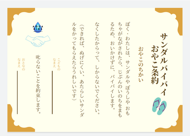 そこで、子どもの水辺の安全教育を啓発するNPO法人AQUAkids safety projectで【サンダルバイバイおやこ条約】を作成致しました。