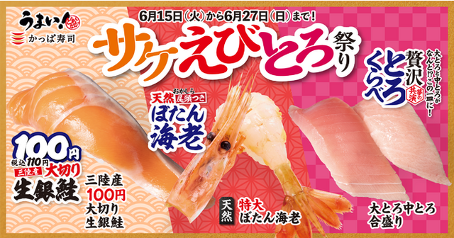 “かっぱ寿司 うまい!品質宣言”後初となる、食べると思わず‘うまい!’がこぼれる6月の“どまんなかネタ”には「サケえびとろ」の厳選した3商品が登場します。