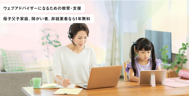 そこで、子育て・病気・失業といった制約により「働きたいけど働けない」「学びたいけど学べない」という方に、ウェブアドバイザーという新しい働き方のご提案と、学びの機会を1年間無料でご提供します。