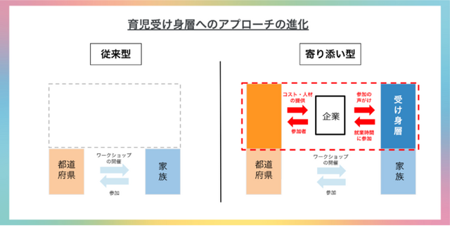 三重県少子化対策課から委託により、コネヒトが運営する「パートナーとともに行う育児推進事業」においては、県内企業・団体および市町と密な連携を行い、各ステークホルダーで継続的に実践されることによって、育児受け身層も含めたより多くの家族へ継続的に届けることが可能となり、男性育児の質および満足度の向上を実現いたします。