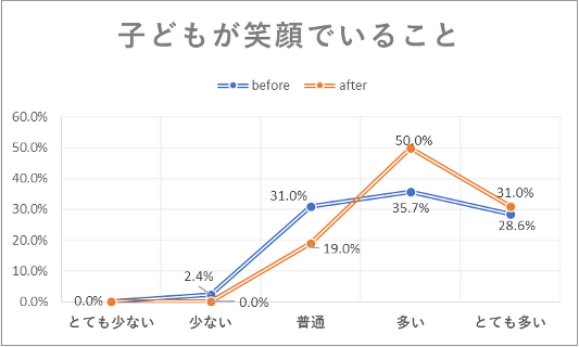 実験の中で毎日の生活リズムや歩数を計ることが、子どもを観察する良い機会となり、親子のコミュニケーションのきっかけになっていることがわかる。特に注目したいのは、「子どもが笑顔でいることが多い」の回答数が、実験後に増えたこと。1日に子どもが何回笑ったのか、その数を計測することはできず主観的な判断となるが、母親がまさに「主観」で「子どもの笑顔が多いと感じた」ということが重要だと考えられる。なぜならそれは、母親が子どものことを肯定的に捉えているという証だからである。子どもの笑顔を見ると、親は幸せな気持ちになるもの。今回の実証実験が、親子関係の良化に貢献しているといえる。