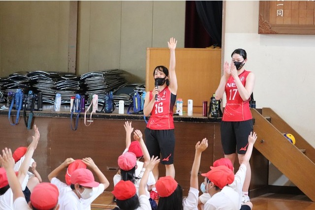 6月15日(火)、川崎市立鷺沼小学校にて「ふれあい教室」を実施し、NECレッドロケッツに所属する小島満菜美選手・川上雛菜選手が先生役として参加した。
