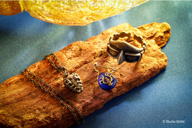 「天空の城ラピュタ」からは、ラピスラズリの天然石を使用した飛行石のピアスやロボット兵をデザインしたネックレスの他、女海賊ドーラが身に着けている、鼻の形が特徴的なゴーグルを再現した「リング ドーラのゴーグル(8,800円・税込)」など、作中の印象的なモチーフを本格的なアクセサリーに仕上げました。