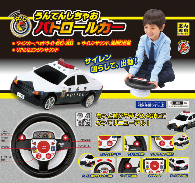 ロングランの「R/Cうんてんしちゃおパトロールカー」が2.4GHzになってもっと遊びやすくなりました。ハンドル型コントローラーでパトロールカーを操縦しよう!ウインカー、クラクション、ライト、サイレンなど本物のような運転遊びが楽しめます。