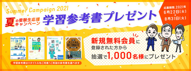 受験生や高校生に使ってほしい学研の人気の学習参考書11冊をセレクト! 期間中に無料会員登録をした方のうち、抽選で合計1000名様にプレゼントします(応募の際に希望する一冊を選択可能です)。学習参考書と映像授業を組み合わせて、夏の学習をグッと充実させましょう!