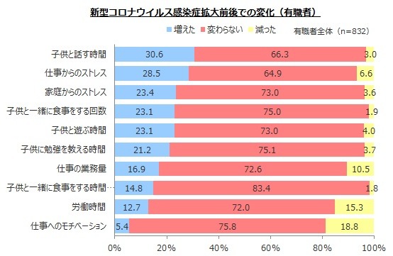 子供と話す時間が「増えた」30.6%、仕事からのストレスが「増えた」28.5%