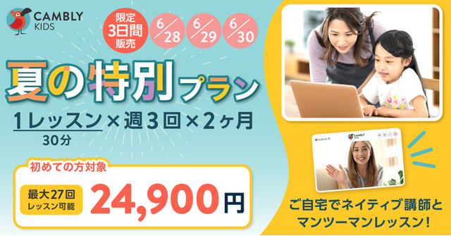 Cambly Inc.(本社:アメリカ・サンフランシスコ、日本代表:佐藤 亜希子)は、子ども向けオンライン英会話サービス「CAMBLY KIDS(キャンブリー キッズ)」の夏限定特別プランを、6月28日(月)から6月30日(水)までの3日間販売いたします。