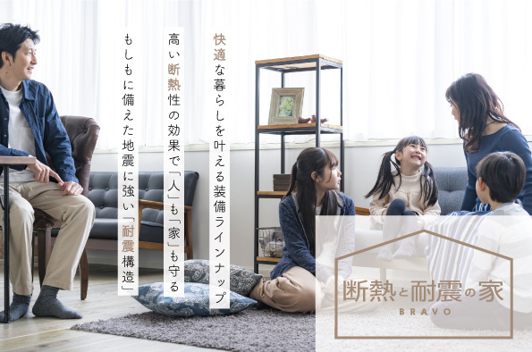 『断熱と耐震の家 BRAVO(ブラーボ)』は、「理想の住まい」に求められる「断熱性」「耐震性」を高め、新たなライフスタイルにフィットした快適な住まいを提供します。