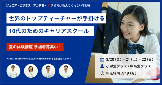 10代のための新しいキャリアスクール「ジュニア・ビジネス・アカデミー」は、2021年秋冬の本格開校に向け、本日より8月の体験講座の抽選お申込みを開始しています。※7/19(月)〆切