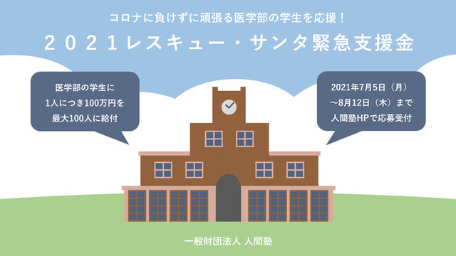 学生に給付型奨学金による経済的支援と、人生の軸を学ぶ人間教育を展開する一般財団法人 人間塾(代表理事:仲野 好重)は、志を持ちながらもコロナ禍で経済的な不安を抱える医学部の学生を対象に、1 人につき 100 万円を最大 100 人に支給する総額 1 億円の緊急支援金を実施することを決定し、2021 年 7 月 5 日(月)から応募を開始します。