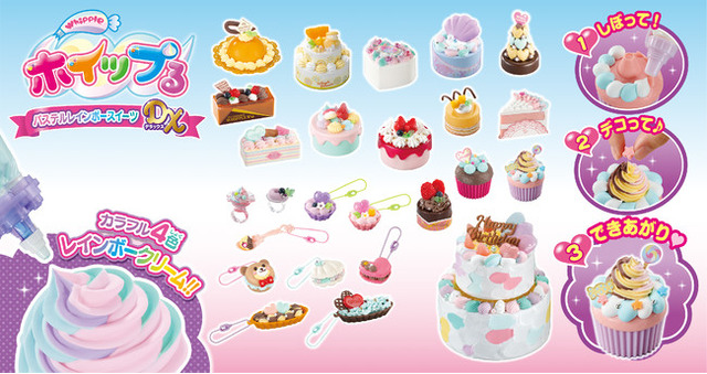 「パステルレインボースイーツDX」は、クリーム7本と口金5種が入っており、大きなケーキやアクセサリーにできるスイーツ10個を含め、全25種のスイーツを作ることが可能です。さらにカラフルで色鮮やかな「レインボークリーム」がしぼれるツールも入った盛り沢山なセットです。