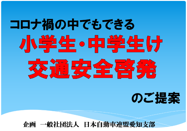 JAF(一般社団法人 日本自動車連盟)愛知支部(支部長 寺町一憲)は7月12日(月)より、愛西市教育委員会(教育長 平尾 理氏)協力のもと、愛西市立永和中学校(学校長 衛藤 義隆氏)にて、交通安全教育プログラムを開始します。この交通安全教育プログラムは、小、中学生向けに交通安全に関する知識の向上、交通事故防止を第1目的にギガスクール構想で各小、中学校に配備された端末等へ生配信します。