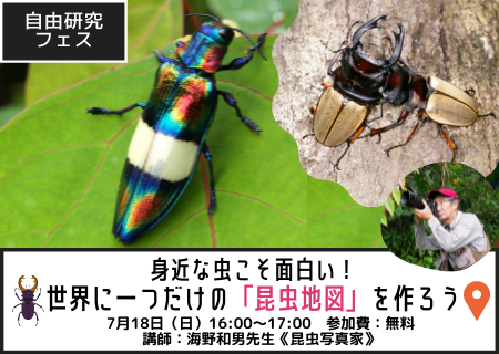 7月18日(日)16:00からは、昆虫写真家で、日本自然科学写真協会会長の海野和男氏による「身近な虫こそ面白い!世界に一つだけの『昆虫地図』を作ろう」を、参加費無料で開催予定です。