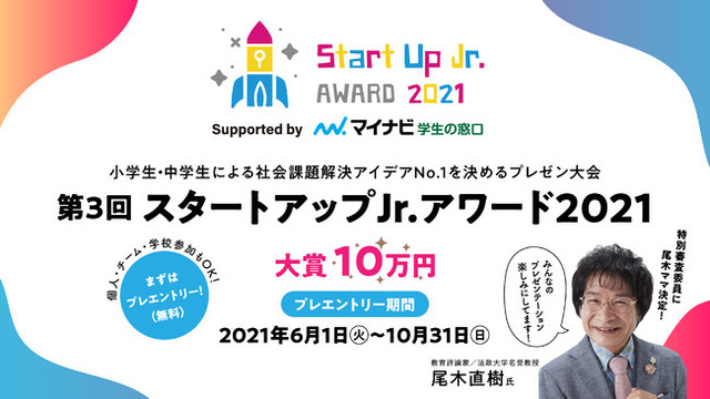 子どもの体験型キャリア教育およびビジネス教育事業を推進している株式会社バリューズフュージョン(本社:東京都港区、代表取締役社長:竹内 慶太、以下バリューズフュージョン)が開催している小学生・中学生による社会課題解決の優れたアイデアを競うプレゼン大会『スタートアップJr.アワード2021』(後援:東京都、公益社団法人2025年日本国際博覧会協会)の開催概要が決定しました。今年度は高校生向けビジネスコンテスト、『キャリア甲子園』を運営するマイナビ学生の窓口が冠スポンサーとなり、特別審査員には「尾木ママ」こと尾木直樹氏も登壇。また、受賞したチームを牽引された先生を表彰する「ベストナビ・ティーチャー賞」も新たに設けるなど、3回目を迎える今年度大会は一層の盛り上がりが期待されます。個人・チーム・学校単位でのプレエントリーをお待ちしています。(公式サイト: https://startupjr-award.jp )