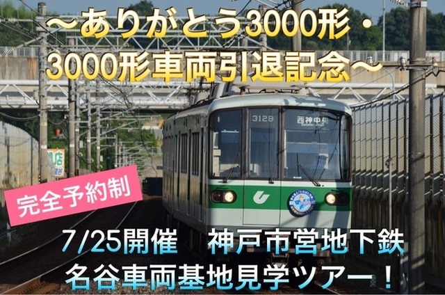 この度、株式会社ビートラベル(神戸市中央区、代表取締役:渡邊 華穂)は、神戸市交通局共催のもと、7月9日(金)より事前予約限定参加イベント「~ありがとう3000形・3000形車両引退記念~<普段は見れない!>名谷車両基地見学ツアー」の予約販売を開始する事をお知らせ致します。