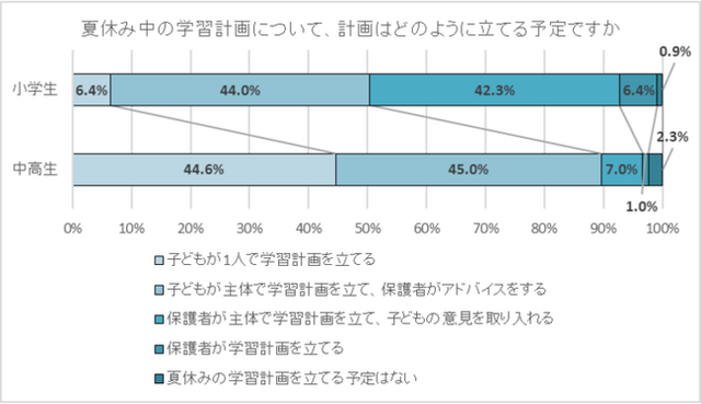 一方、中高生の保護者は、小学生の保護者と同じく、「子どもが主体で学習計画を立てて、保護者がアドバイスをする」が最も多かったものの、「子どもが1人で学習計画を立てる」も44.6%と高く、子どもが主体で学習計画を立てる予定であることが明らかとなった。