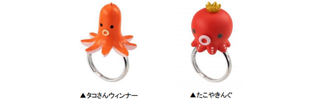 本商品は、直径約5.4cmのたこ焼きの形をしたケースの中に様々なたこをモチーフにした指輪が入っている