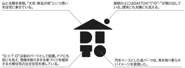 家にも見え、それぞれのパーツにDAITOをちりばめ、想像性のある家づくりを表したマークとしました。また下記のようなアレンジも可能としているので、今後様々な媒体にあわせてこれらマークを活用し、大東住宅の訴求を図って参ります。